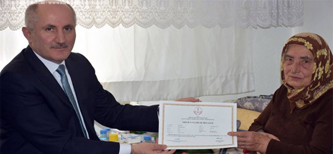 Cumhurbaşkanımız Recep Tayyip Erdoğan ve eşleri Hanımefendi Emine Erdoğan’ın himayelerinde başlatılan Okuryazarlık Seferberliği kapsamında birinci kademe seviye tespit sınavında başarılı olup Okur Yazarlık Belgesini almaya hak kazanan 87 yaşındaki Dudu Teyze belgesini Karaman Valisi Fahri Meral’in elinden aldı.
