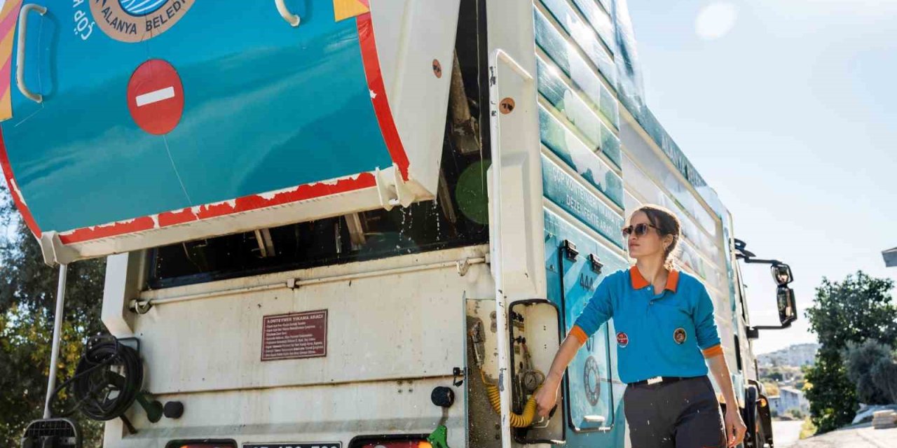 Kadın personelin temizlik çalışmaları, Alanya'nın farklı bölgelerinde dikkat çekiyor. Titizlikle yapılan temizlik çalışmalarına ilaveten, ağır vasıta çöp konteyner yıkama ve dezenfekte aracı sürücülüğü için de bir kadın şoför görevlendirildi. Bu kadın şoför, şehrin dört bir yanında temizlik ve sağlık için büyük bir titizlikle görev yapıyor.