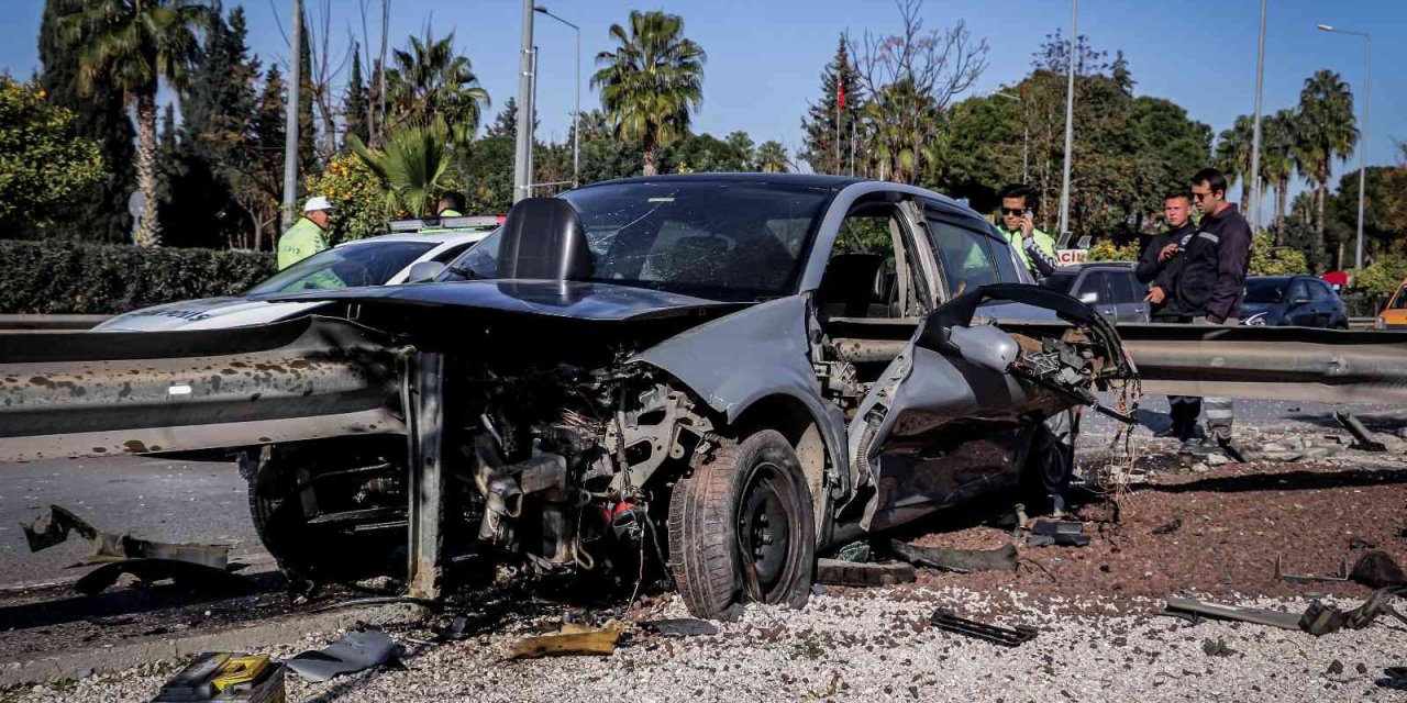 Antalya'da direksiyon hakimiyetini kaybeden sürücünün kullandığı otomobil, demir bariyerlere çarptı.