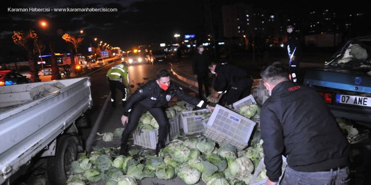 Antalya'da Kaza Nedeniyle Yola Saçılan Lahanaları Polisler Topladı