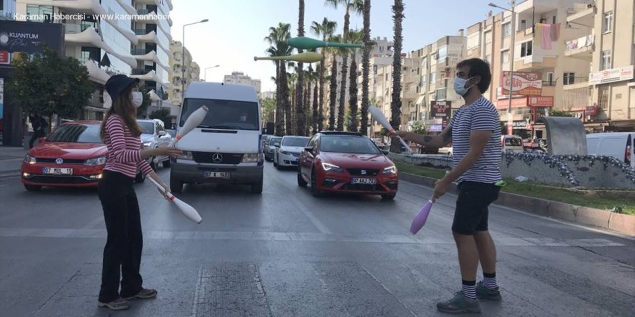 Antalya'da üniversite öğrencisi iki jonglörün trafik ışıklarında yaptıkları gösteriyi, sürücüler ve çevrede toplanan vatandaşlar ilgiyle izledi.