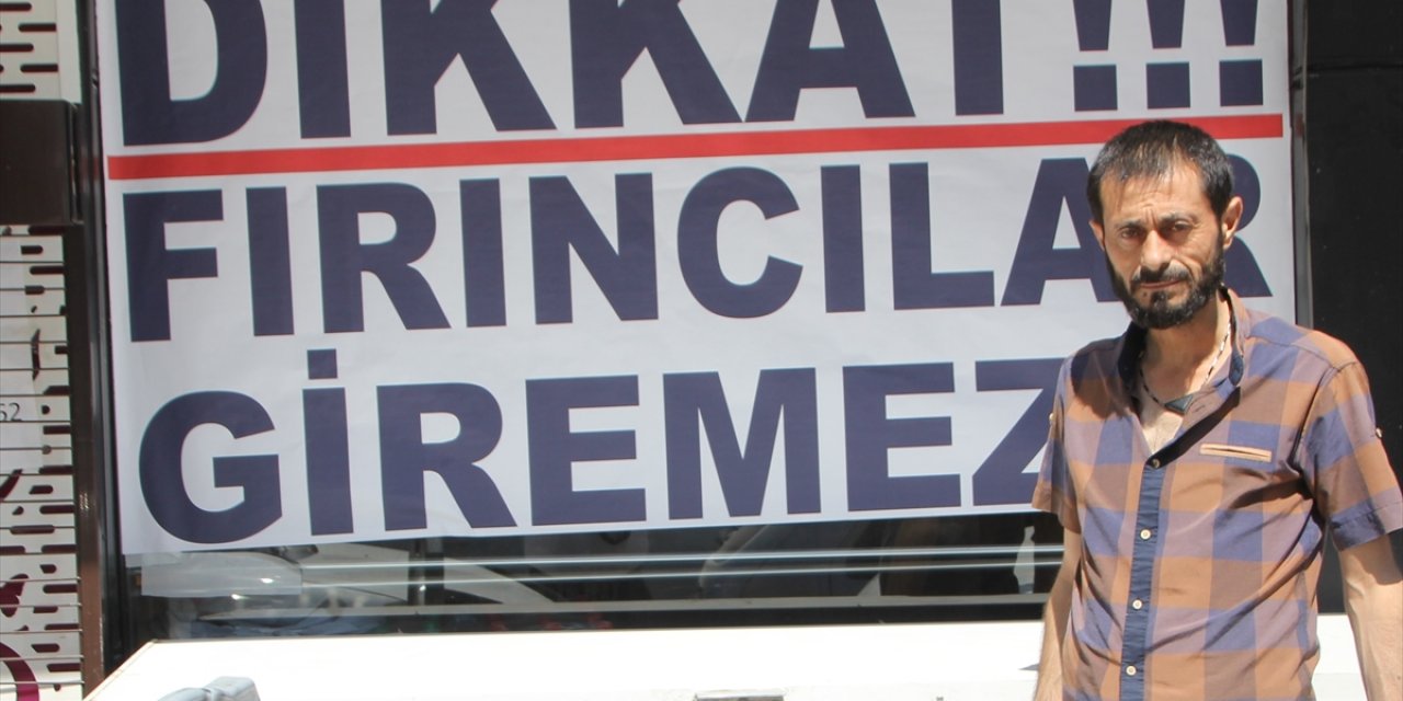 İşletmenin girişine "Dikkat fırıncılar giremez" tabelası asan Okatan, gazetecilere yaptığı açıklamada, vatandaşın salgından dolayı sıkıntı yaşadığını dile getirdi.
