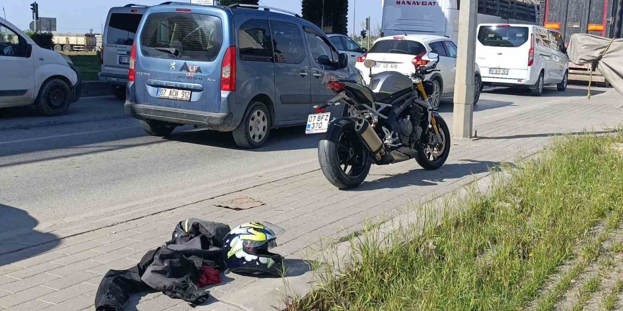 Antalya'da yolda kırmızı ışıkta bekleyen araçların arasından geçerek ilerleyen motosiklet yoldan yaya olarak geçmekte olan vatandaşa çarptı.