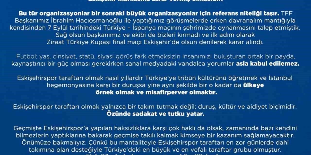 Başkan Albayrak, şehrin ve takımın geleceği için çaba göstermeye devam edeceğini vurgulayarak,"Geçtiğimiz gün, Ziraat Türkiye Kupası finalinin şehrimizde olacağı duyurulmasının ardından konu epeyce gündem oldu. Haddini aşmayan eleştiriler başımızın tacı. Ancak, haddini aşan bazı yorum yapanlarla tek merkezden yönetilerek olayı farklı yerlere çabasında olan sözde danışmanlar ve ekürileri sizler Eskişehir'e ihanet eden toksik tiplersiniz... Eskişehirspor taraftarı bir vatandaş olarak, Eskişehirspor'umuzun ve şehrimizin geleceği için elimden geleni her fırsatta yapma çabası içerisindeyim, olmaya da devam edeceğim. Bizi üzen asıl nokta daha finalistler belli olmadan dahi şehirde yapılan "kaos olur" algısının Eskişehir markasına zarar vermiş olmasıdır" dedi.