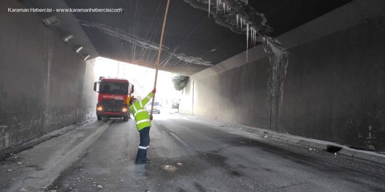 Ekipler, özellikle köprü altları ve tünellerde sürüş güvenliğini olumsuz etkileyen ve can güvenliği riski oluşturan buz sarkıtlarını trafiği aksatmadan kontrollü temizliyor.