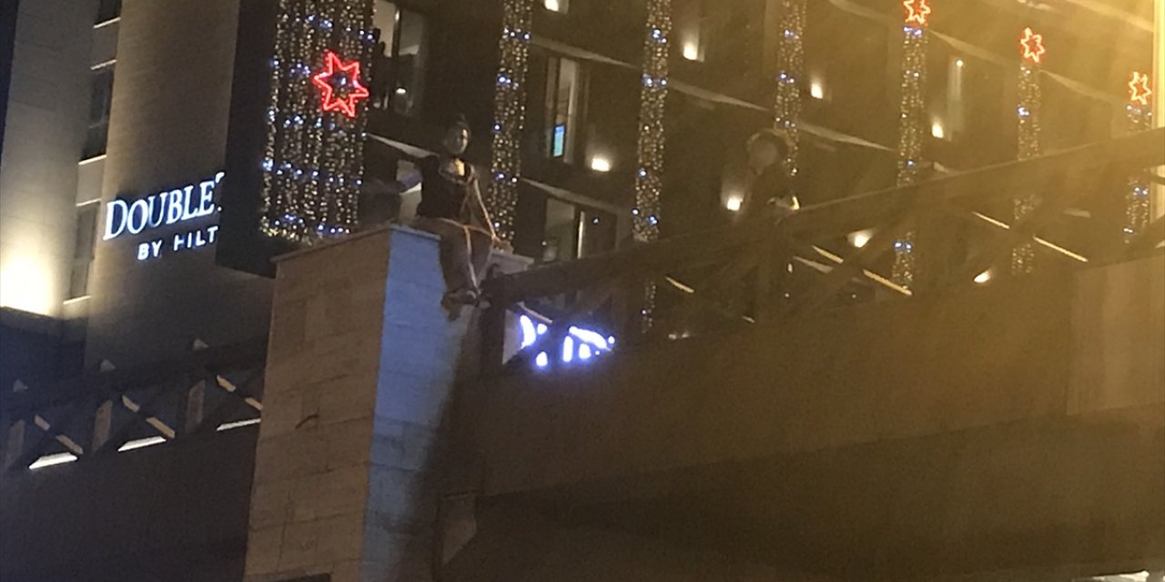 Çevredeki vatandaşlara bağıran ve zaman zaman aşağıya sarkan genç kız, yanındaki bir erkek ve ekipler tarafından sakinleştirilmeye çalışıldı. Yarım saat süren ikna çabası sonuç vermeyince bekçiler, sakinleştirmek istedikleri kızın yanına gitmeye çalıştı. Durumu fark eden genç kız, kolondan inerek, trafiğin olduğu caddede koşmaya başladı.