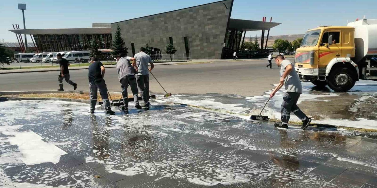 Kayseri Büyükşehir Belediyesi ekipleri tarafından Şehirlerarası Otobüs Terminali çevresinde kapsamlı yıkama ve temizlik çalışması yapıldı.
