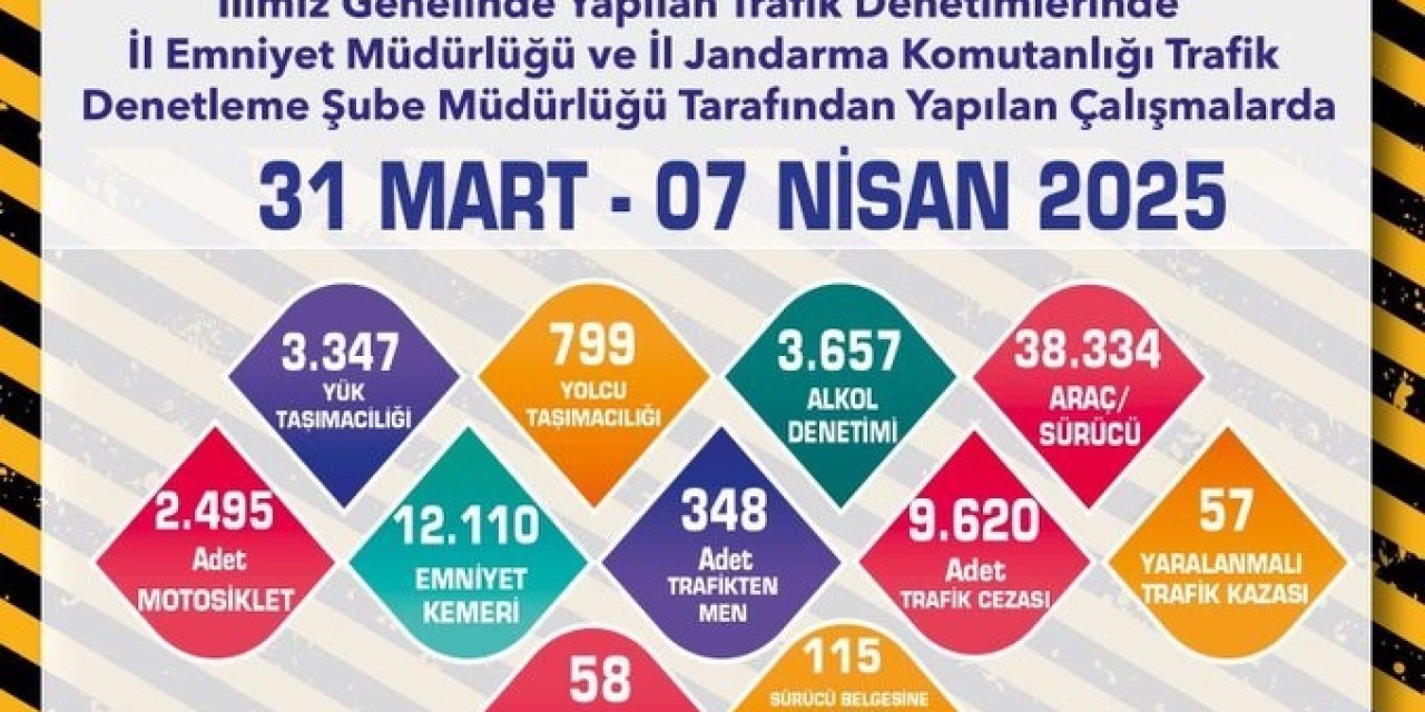 Edinilen bilgilere göre, Eskişehir İl Emniyet Müdürlüğü ve İl Jandarma Komutanlığı Trafik Denetleme Şube Müdürlüğü ekiplerince trafik denetimleri yapıldı. Kent genelinde 31 Mart - 7 Nisan tarihleri arasında yapılan denetimlerde; 3 bin 347 yük taşımacılığı, 799 yolcu taşımacılığı, 3 bin 657 alkol denetimi, 12 bin 110 emniyet kemeri ve 2 bin 495 motosiklet denetimi gerçekleştirildi. Denetimler kapsamında toplam 38 bin 334 sürücü kontrol edilirken, 9 bin 620 adet trafik cezası yazıldı. Ayrıca, 348 araç trafikten men edilirken 115 sürücünün ehliyetine el konuldu. Yanı sıra 57 yaralanmalı trafik kazasına ve 58 maddi hasarlı kazaya ise müdahale edildi.