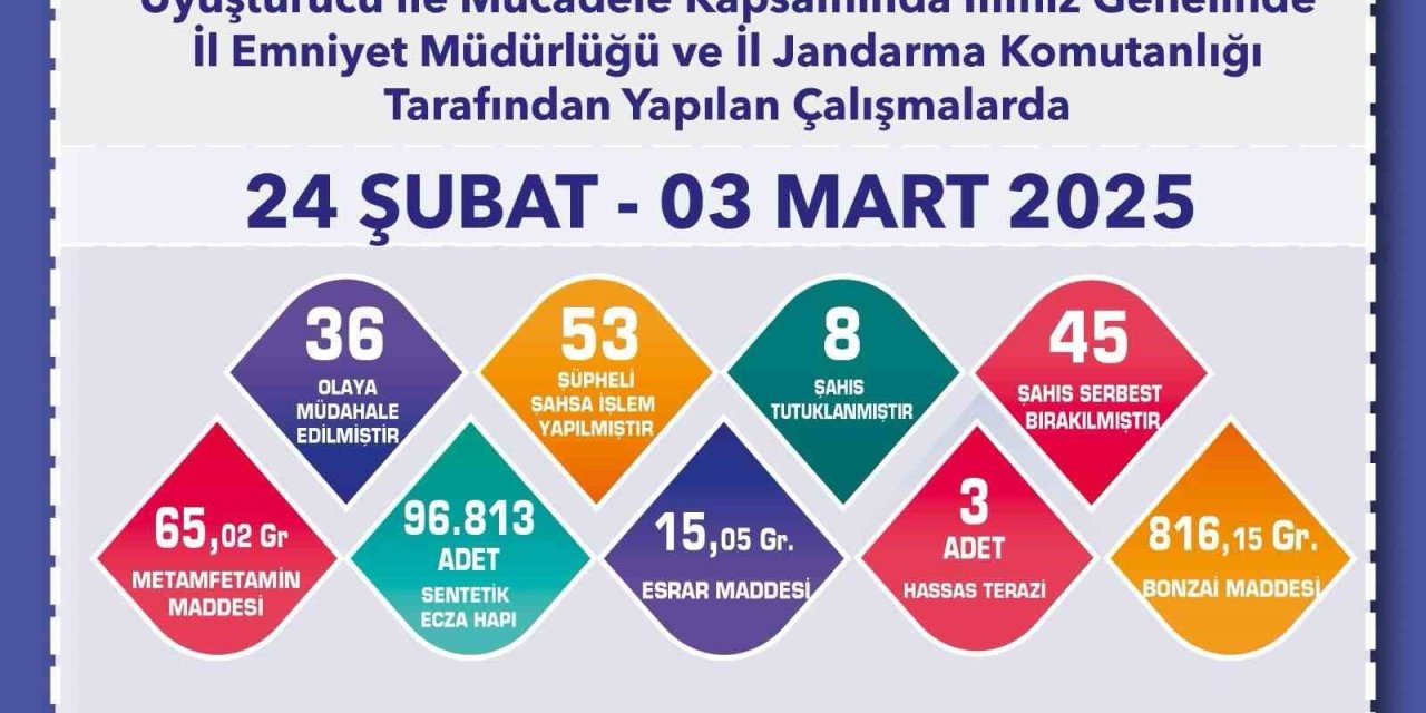 Alınan bilgiy göre, Uyuşturucu ile mücadele kapsamında Eskişehir'de İl Emniyet Müdürlüğü ve İl Jandarma Komutanlığı tarafından çalışma yapıldı. Belirli tarihler arasında yapılan çalışmalarda, 36 olaya müdahele edilirken; 65,2 gram metamfetamin maddesi, 96 bin 813 adet sentetik ecza hapı, 15,5 gram esrar maddesi, 816,15 gram bonzai maddesi ve 3 adet hassas terazi ele geçirildi. Çalışmalarda işlem yapılan 53 şahıstan 8'i tutuklandığı öğrenildi.