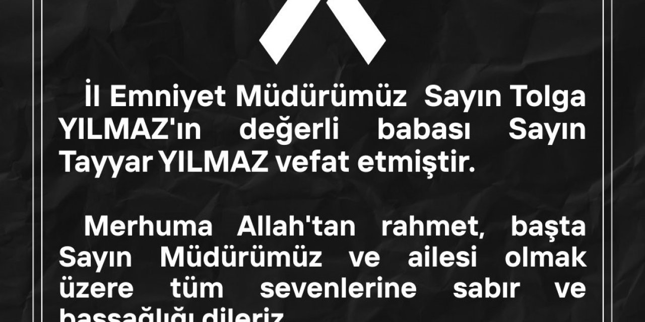 İl Emniyet Müdürlüğü, acı haberi sosyal medyadan duyuruldu. Müdürlük tarafından sosyal medyadan yapılan açıklamada, İl Emniyet Müdürü Tolga Yılmaz'ın babası Tayyar Yılmaz'ın vefat ettiği belirtildi. Paylaşımda, "Merhuma Allah'tan rahmet, başta sayın müdürümüz ve ailesi olmak üzere tüm sevenlerine sabır ve başsağlığı dileriz" ifadeleri yer aldı.