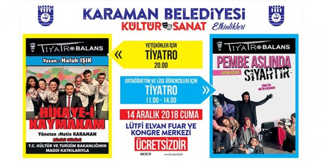 Karaman Belediyesi kültürel ve sanat etkinliklerine ev sahipliği yapmaya devam ediyor. Kültür ve Sosyal İşler Müdürlüğü tarafından tertip edilen seçkin programlar ve tiyatro etkinliklerine bir yenisi daha ekleniyor. 14 Aralık 2018 Cuma günü Lütfi Elvan Fuar ve Kongre Merkezi'nde, saat 11.00 - 14.00 arasında ortaöğretim ve lise öğrencilerine yönelik " Pembe Aslında Siyahtır" isimli tiyatro oyunu sahne alacak. Yine aynı günün akşamında saat 20.00'de yetişkinlere yönelik, "Hikaye-i Kaymakam" isimli tiyatro gösterisi izleyicilerle buluşacak.