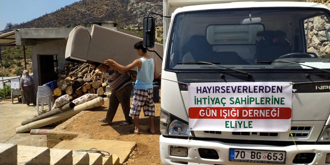 Mersin'in Silifke İlçesinde Yeşilovacık Mahallesindeki orman yangını sonrası evleri ve eşyaları yanarak küle dönen aileye Karaman Günışığı Derneği eşya yardımında bulundu.