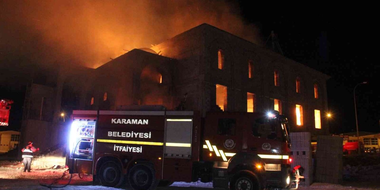 Karaman'da yapımı devam cami inşaatındaki tahta kalıp ve malzemelerin yanması sonucu büyük çapta maddi hasar oluştu.