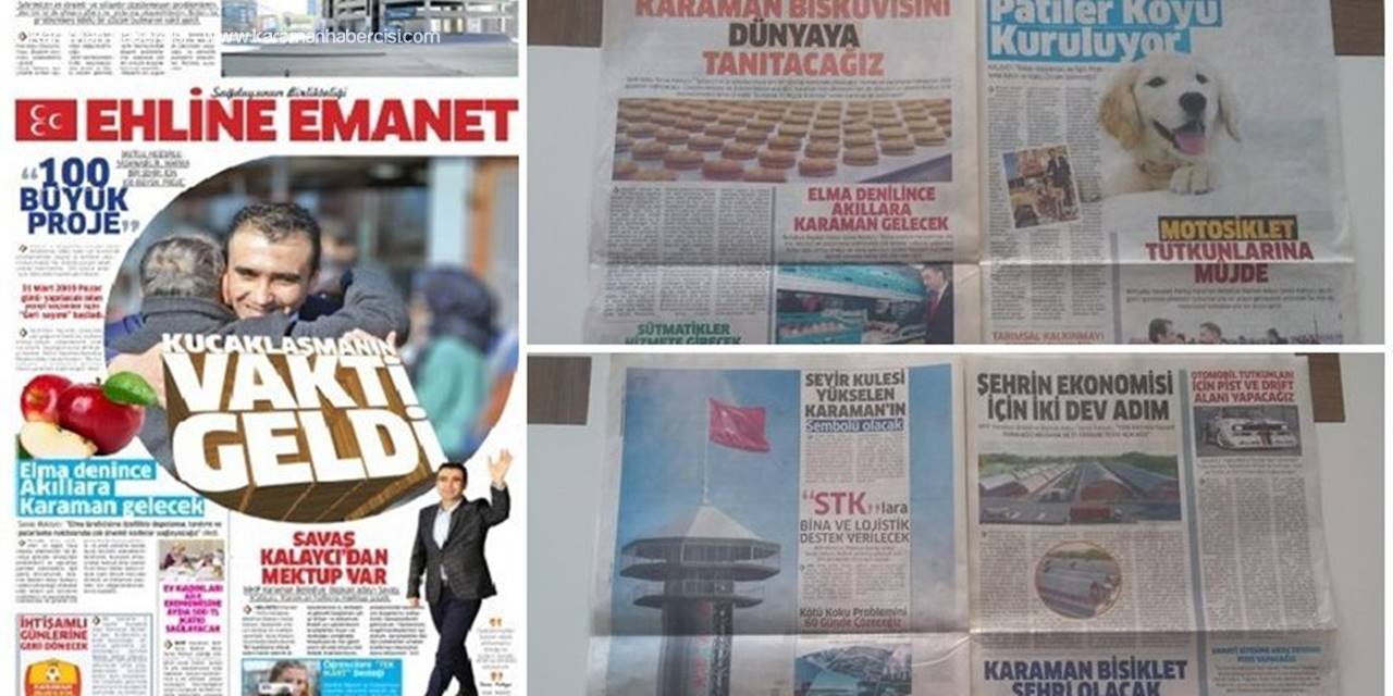 Adaylık sürecinden itibaren çok farklı ve etkili bir seçim çalışmasına imza atarak vatandaşlardan ve Karaman kamuoyundan tam not alan Savaş Kalaycı, bugün dağıtımına başlanan ve büyük beğeni kazanan gazete çalışmasıyla da bu başarıyı perçinlemiş oldu.