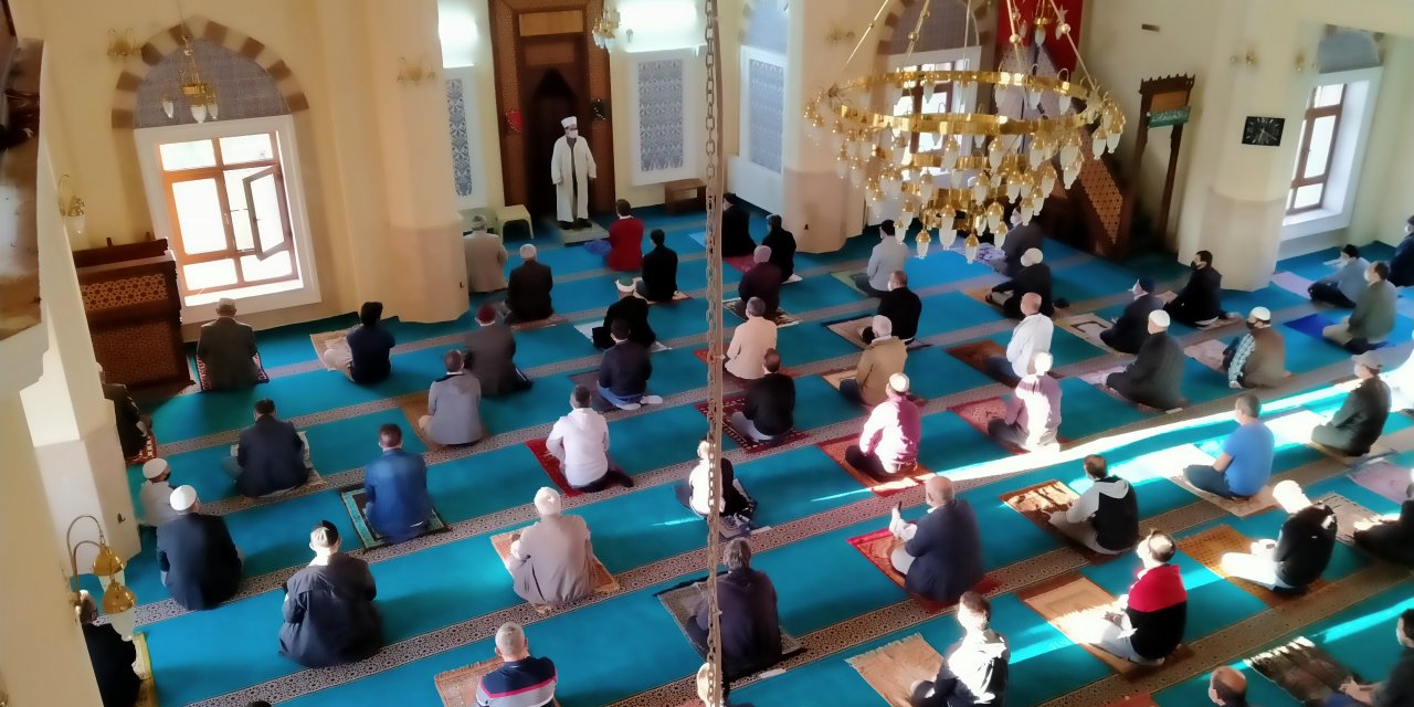 Camiye namaz öncesi gelen vatandaşlar sosyal mesafe kurallarına göre cami içinde ve avlusunda saf tuttu.