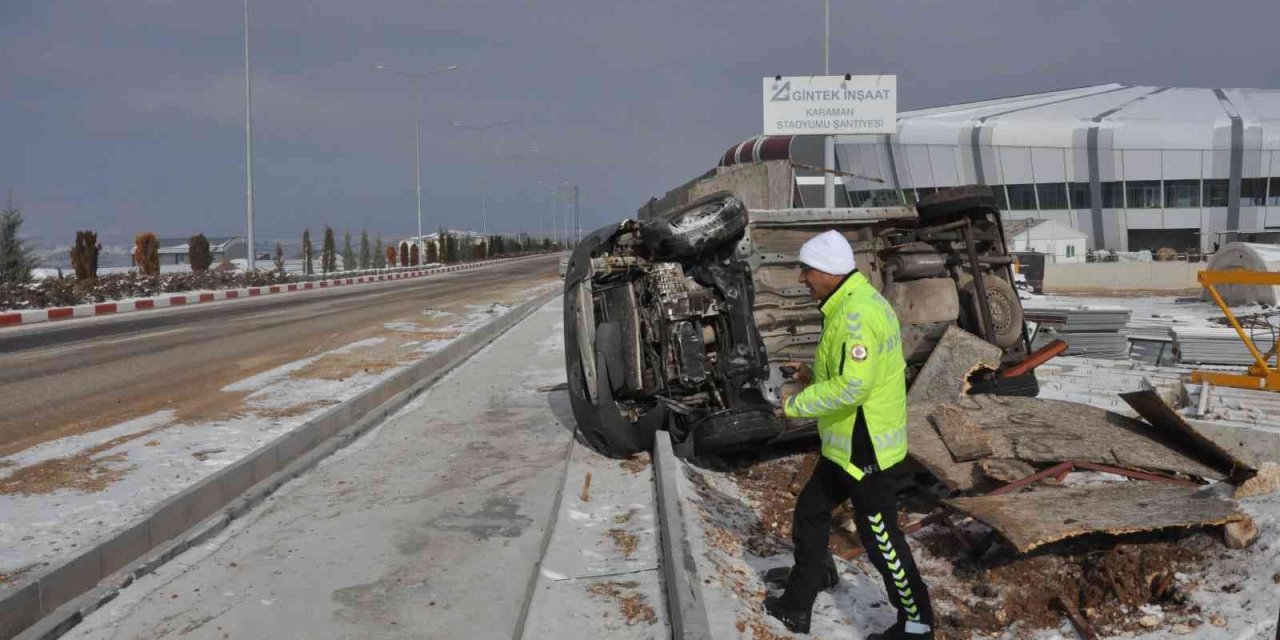 Kar yağışı nedeniyle buzlanan yolda kontrolden çıkan araç, kaldırımı aşarak yeni stadyum inşaatının şantiye bahçesine devrildi. Kazada araçta yolcu olarak bulunan B.Ş. yaralandı. Çevredekilerin haber vermesiyle olay yerine gelen ambulans yaralıyı Karaman Eğitim ve Araştırma Hastanesine kaldırdı. Tedavi altına alınan yaralının sağlık durumunun iyi olduğu öğrenildi.
