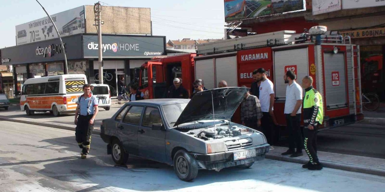 Karaman'da eşi ile birlikte hastaneye giden sürücünün kullandığı otomobil trafik ışıklarında beklerken biranda motor kısmından alev alarak yanmaya başladı. Otomobil, çevredeki vatandaşların yangın tüpüyle müdahale etmesi sonucu yanmaktan kurtarıldı.