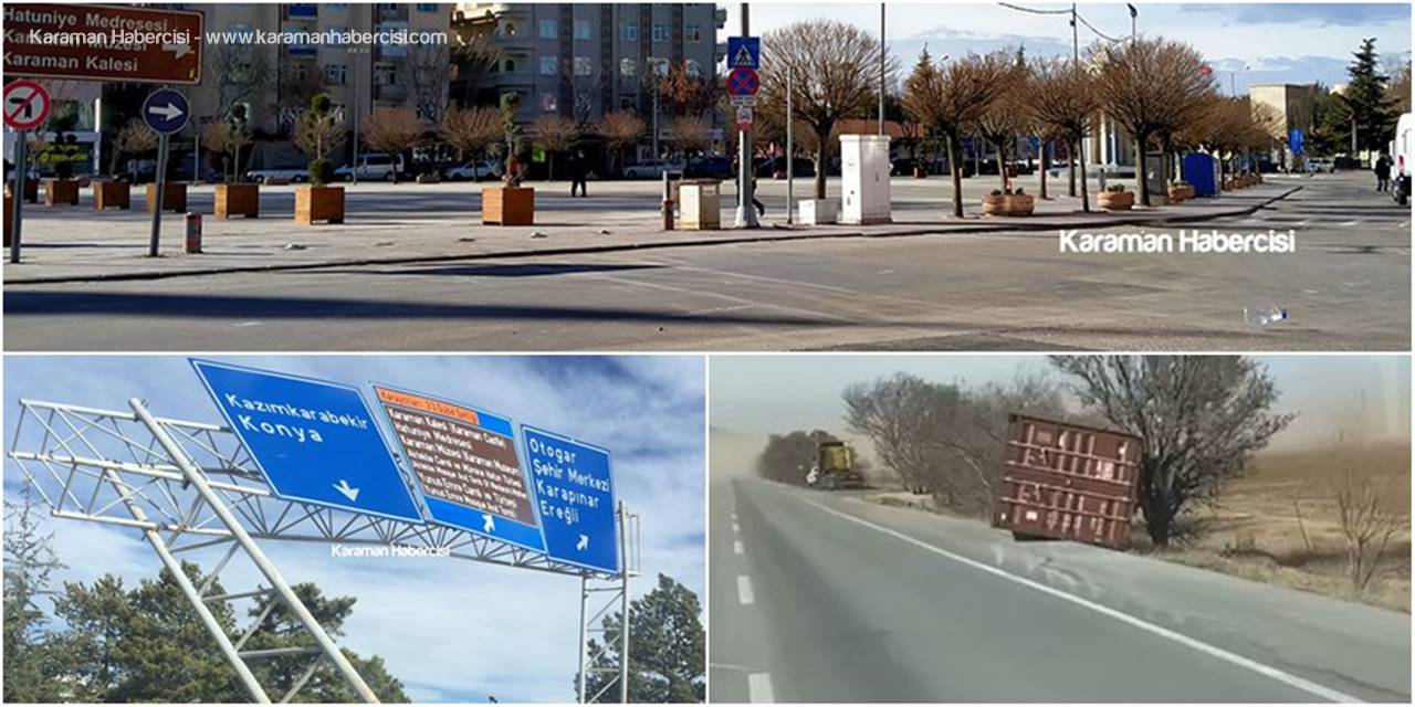 Konya yolunda bir kamyonunda üstündeki yük konteynırının savrulduğu bilgisi alındı. Diğer bir taraftan rüzgarın şiddeti ile Karaman Konya yolunda kaplama üstü bilgi levhalarının da eğilerek arkaya doğru yattığı gözlendi.