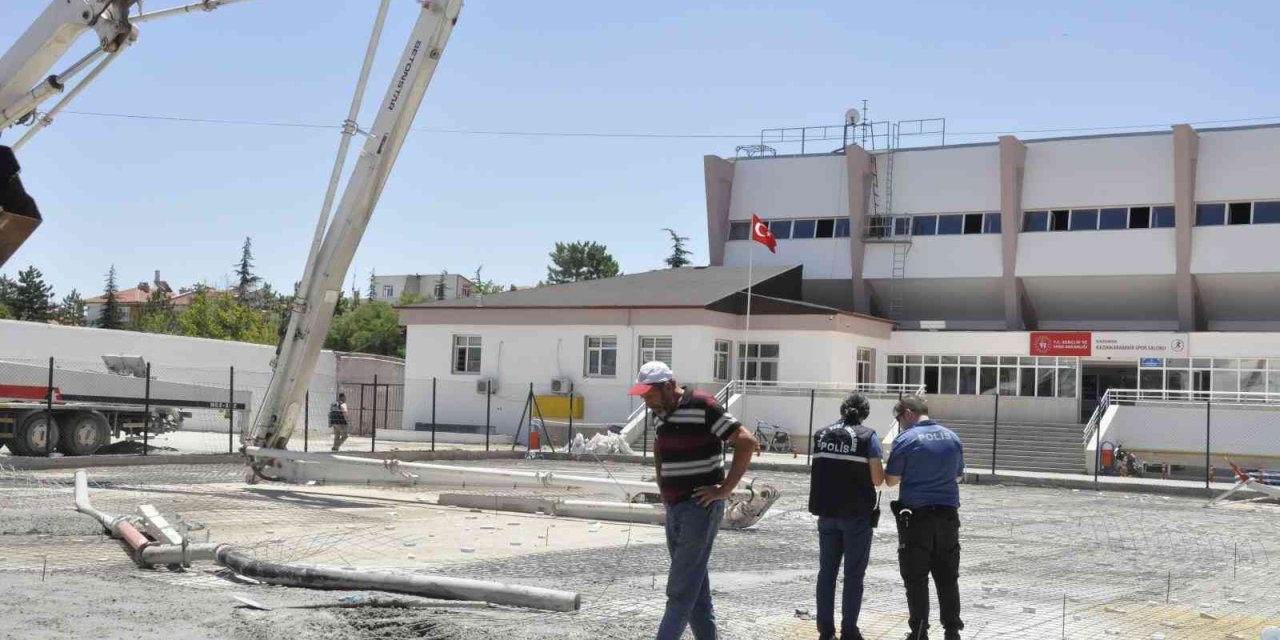 Karaman'da basketbol sahasının temel çalışmaları sırasında yerinden çıkan beton pompasının demir kolu üzerine düşen işçi ağır yaralandı.