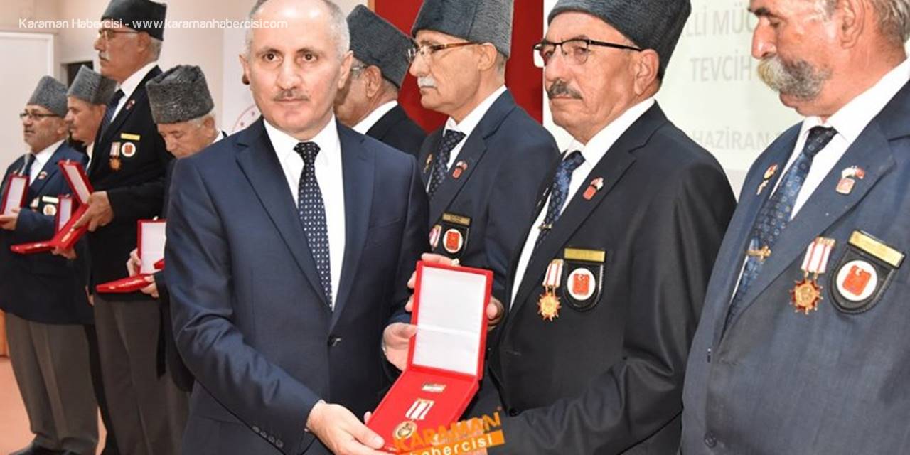 Kuzey Kıbrıs Türk Cumhuriyeti tarafından Milli Mücadele Madalyaları Tüzüğü kapsamında, Kıbrıs Barış Harekâtına katılan Muharip Gazilerimiz için Yunus Emre Konferans Salonunda düzenlenen programa; Karaman Valisi Fahri Meral ve eşi hanımefendi Zehra Meral, Belediye Başkan Vekili Ercan Çalışkan, KMÜ Rektör Vekili Prof. Dr. Birol Üner, Vali Yardımcısı Hacı İbrahim Türkoğlu, İl Jandarma Komutanı İsmail Şahin, İl Emniyet Müdürü Fikret Bayraktar, Muharip Gaziler Derneği Başkanı Behiç Baş ile daire müdürleri, gaziler ve aileleri katıldı.