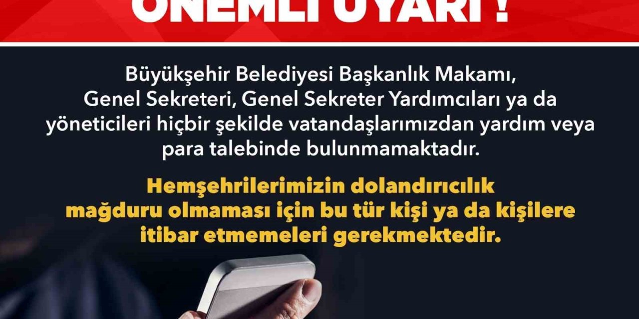 Büyükşehir Belediyesi, son günlerde art niyetli kişilerin belediye adıyla ya da bazı belediye bürokratlarının ismini kullanarak vatandaşlardan para talep ettiği yönünde şikâyetlerin artması üzerine bir uyarı yayınladı.