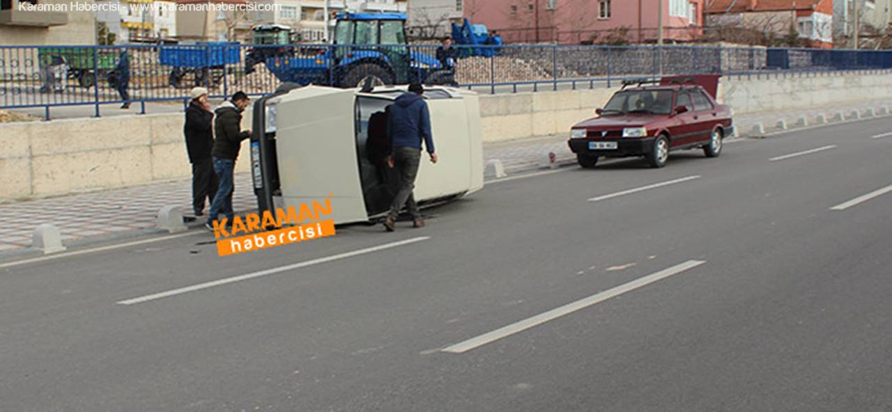 70 EK 187 plakalı otomobil sürücüsünün bir anlık kontrolü kaybetmesi sonucu otomobil kaldırım kenarında bulunan taşa çarparak yol kenarında yan yattı.