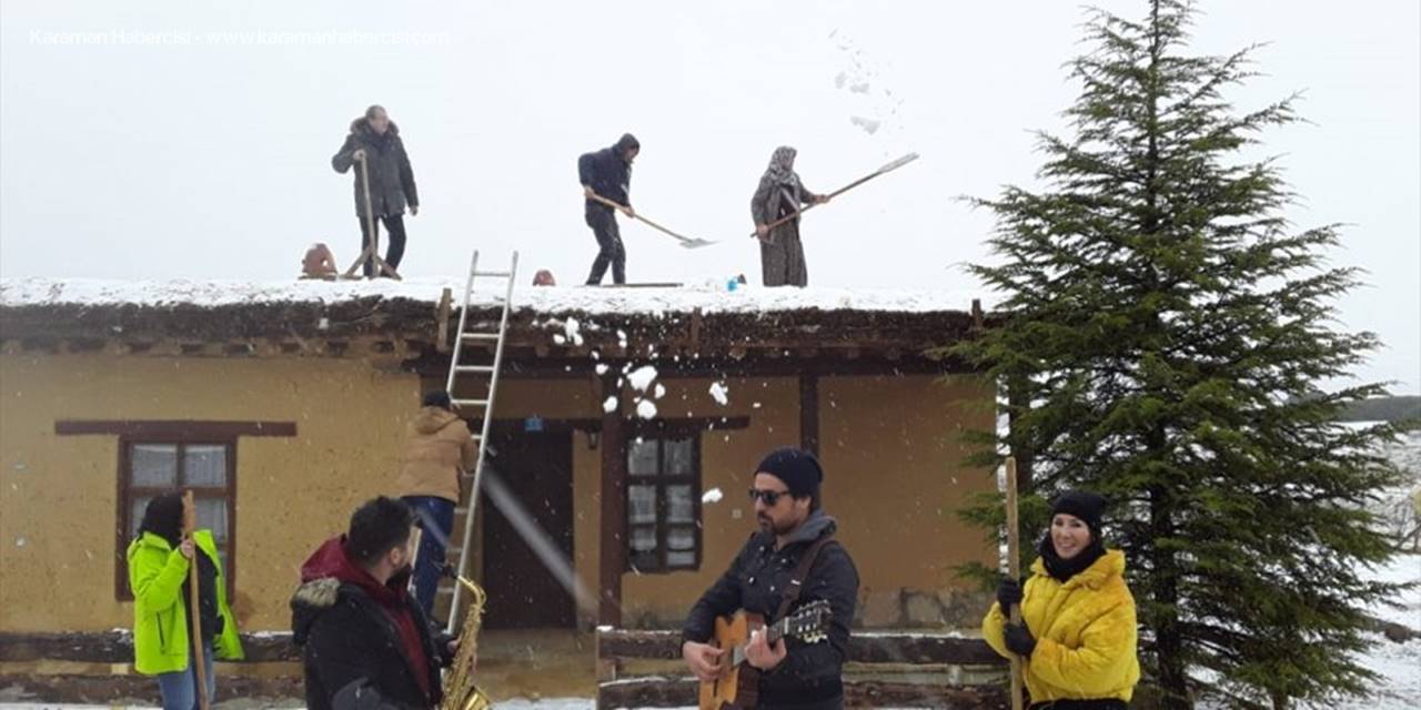 Konya'nın Hüyük ilçesinde, sanatçılar tarafından 2010 yılında kurulan Sonsuz Şükran köyüne gelen bazı sanatçılar, yağan kar altında kerpiç evlerinin toprak damlarındaki karları küredi.