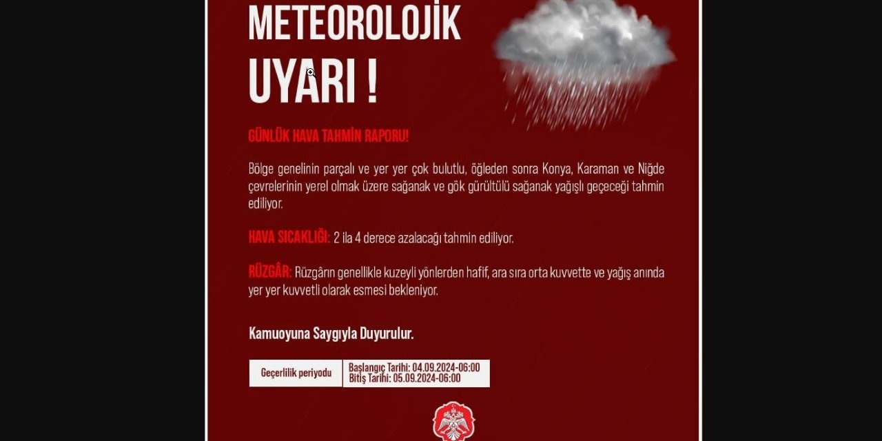 Niğde Valiliği tarafından yapılan uyarıda; bölge genelinin parçalı, yer yer çok bulutlu, öğleden sonra ise Konya, Karaman ve Niğde çevrelerinin yerel olmak üzere sağanak ve gök gürültülü sağanak yağışlı geçeceğinin tahmin edildiği ifade edildi.