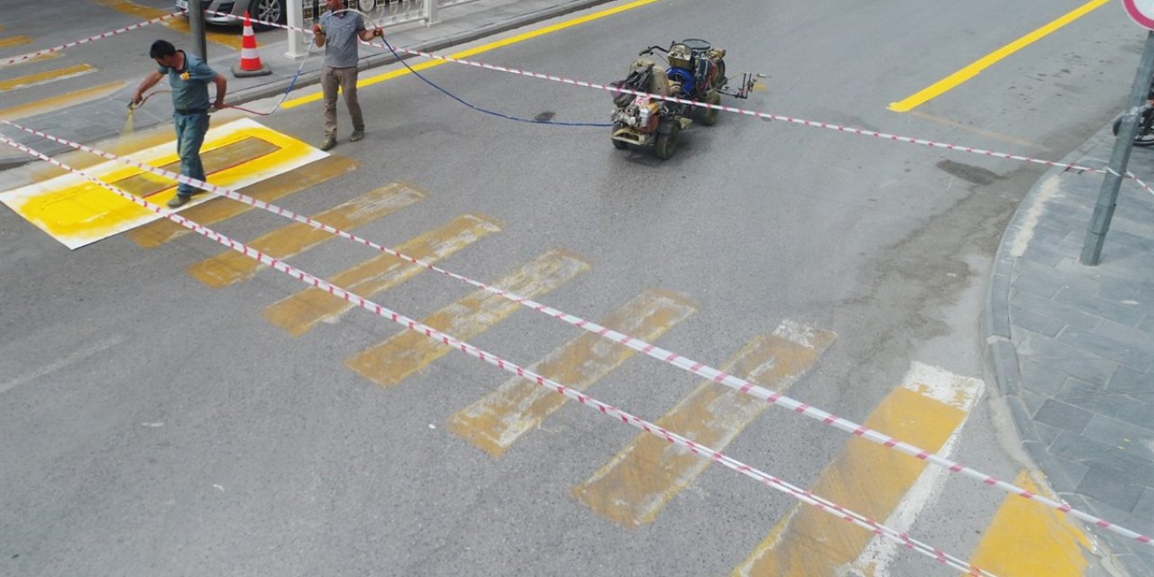 Silinmiş ve görünürlüğünü kaybetmiş mevcut çizgiler yeniden çizilirken, yaya geçit çizgisi olmayan noktalarda da planlama doğrultusunda yeni çizgiler çiziliyor.