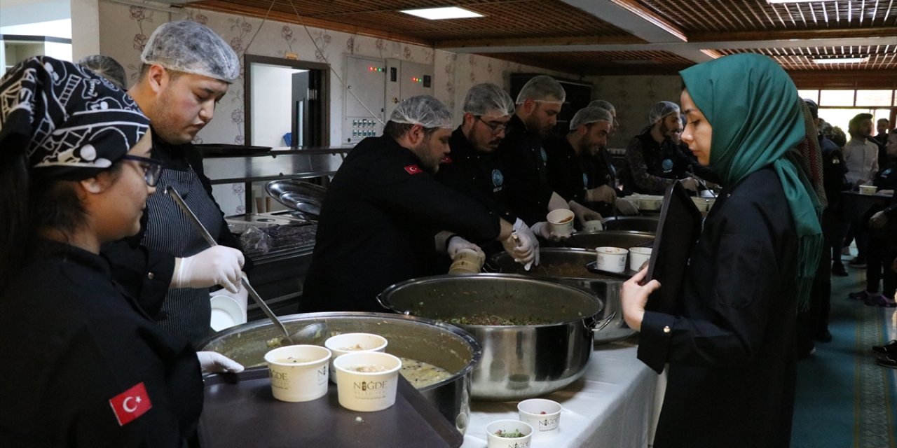 Valilik koordinesinde belediye, Niğde Ömer Halisdemir Üniversitesi, İl Kültür ve Turizm Müdürlüğü iş birliğiyle Sosyal Bilimler Meslek Yüksekokulu uygulama restoranında aşçılık programı öğretim görevlileri ve öğrencilerinin yaptığı tarhana çorbası, üzüm borani, pastırmalı dermason kuru fasulye, ciğerli pilav, bostana salata, aşure ve reyhan şerbeti, katılımcılara ikram edildi.