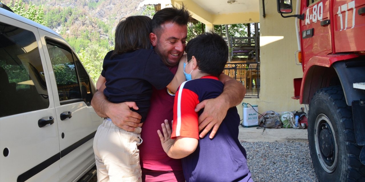 Antalya'nın Manavgat ilçesindeki orman yangınında arazöz üzerinde oğluyla yaptığı telefon görüşmesiyle hatırlanan orman işçisi Süleyman Harun Akıncı, çocuklarına kavuşmanın mutluluğunu yaşıyor.
