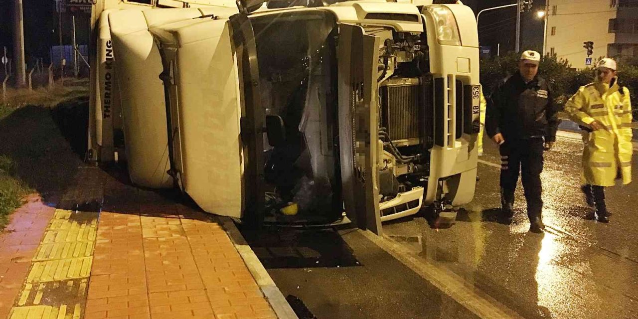 Mersin'in Erdemli ilçesinde sağanak yağış esnasında kontrolden çıkan tır devrildi.