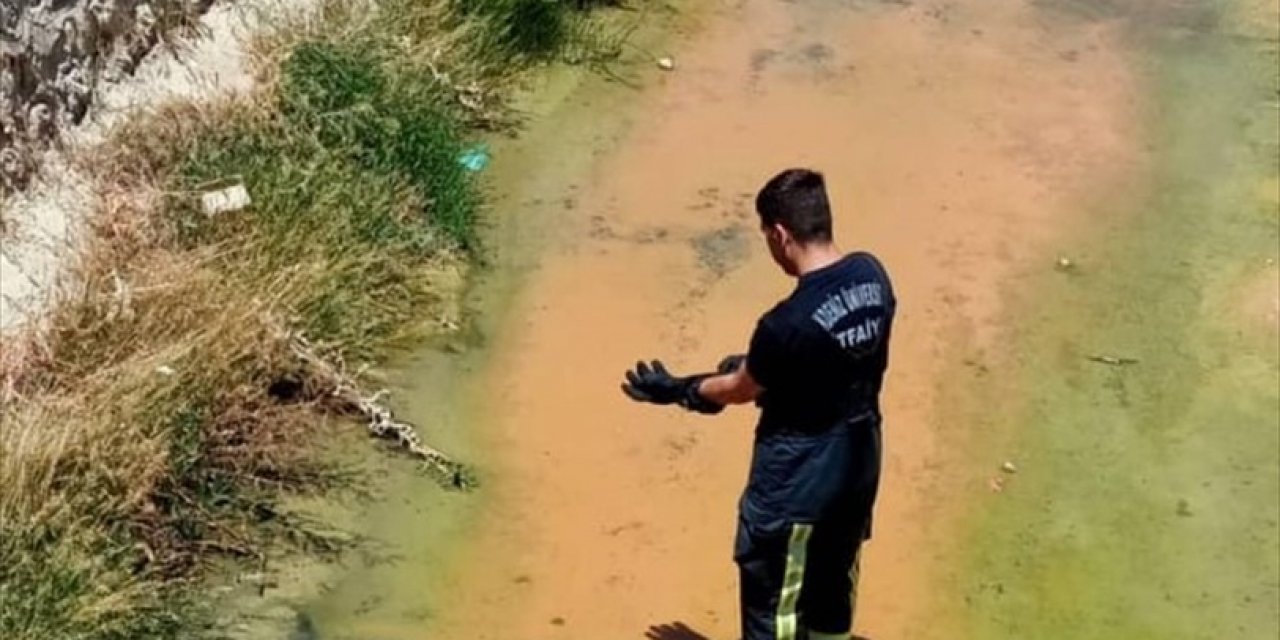 İtfaiye ekibi kanal içerisindeki ıslanmış kediyi eliyle alarak çıkardı.