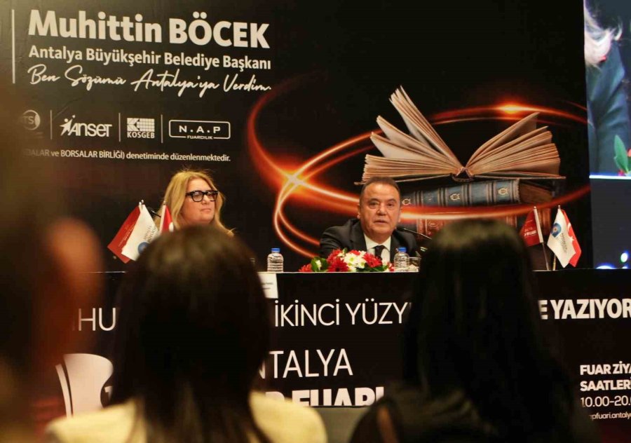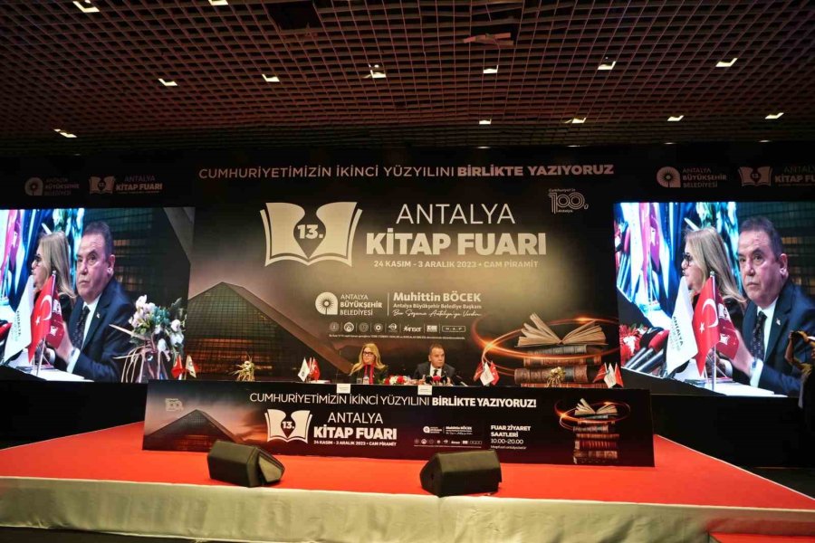 Cumhuriyet'in 100. yılında, 13'üncü Antalya Kitap Fuarı'nı "Cumhuriyet'imizin ikinci yüzyılını birlikte yazıyoruz" sloganıyla gerçekleştireceklerini kaydeden Başkan Muhittin Böcek, şunları aktardı:
