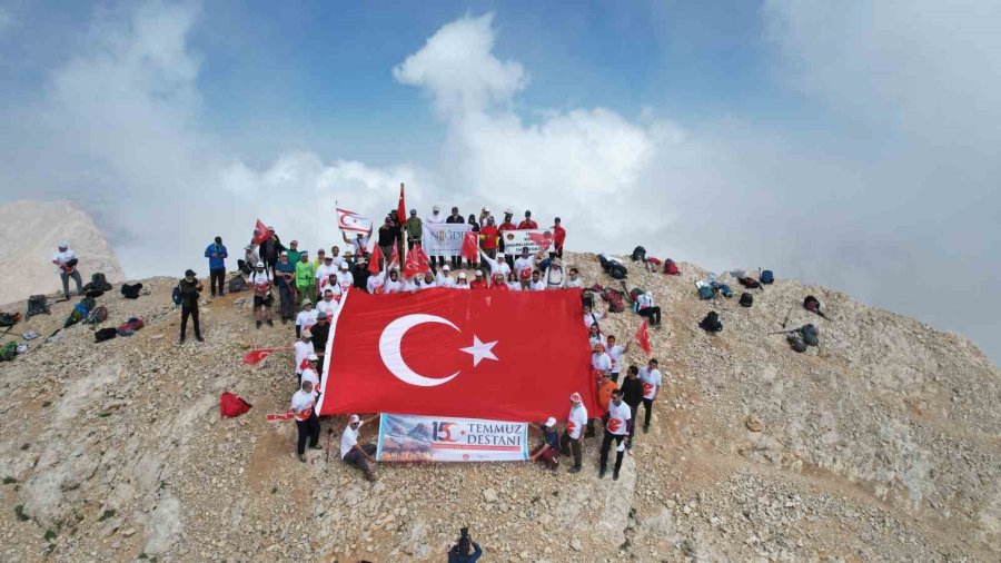 Niğde'de "15 Temmuz Demokrasi ve Milli Birlik Günü" etkinlikleri kapsamında dağcılar, 253 şehidin isimlerinin yazılı olduğu tişörtlerle Aladağlar'da 3 zirveye tırmandı.