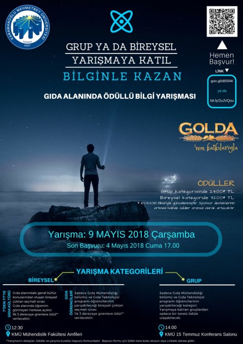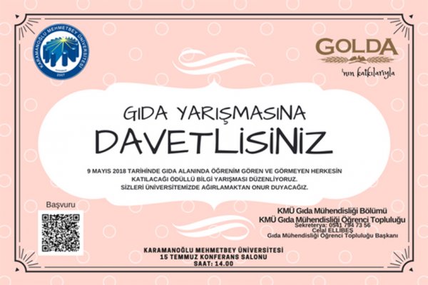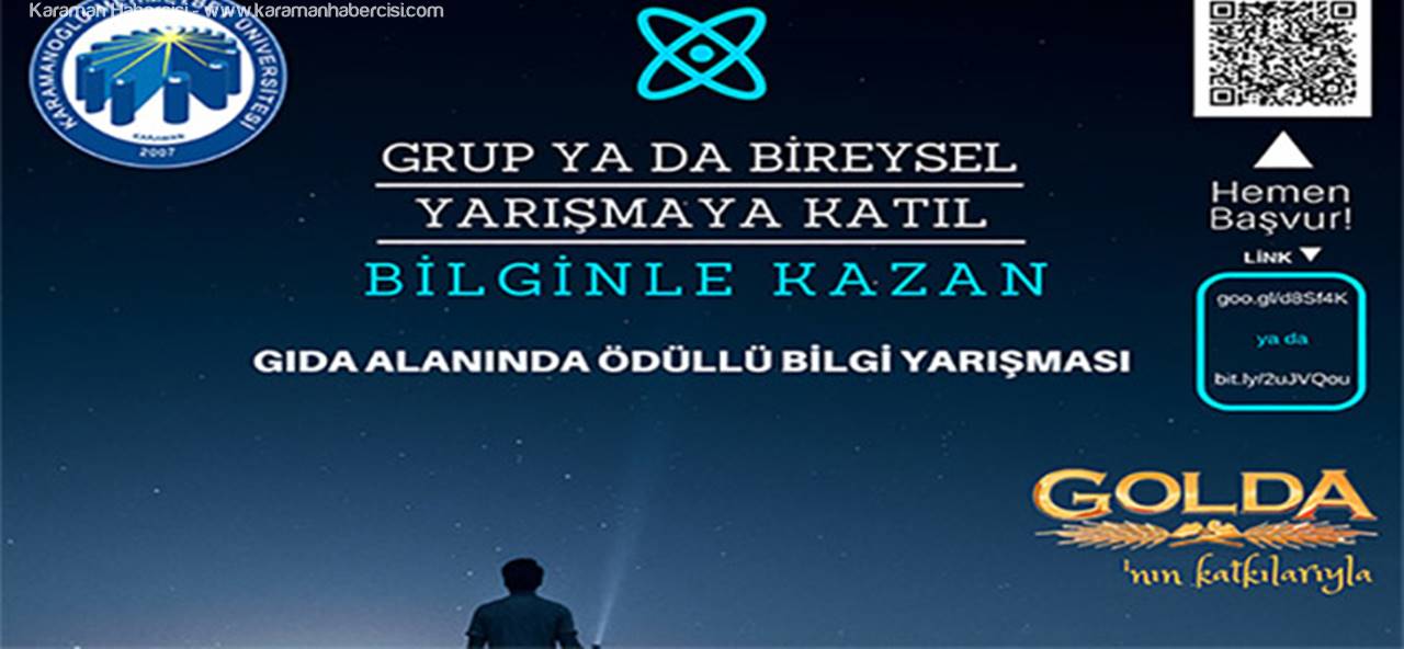Karamanoğlu Mehmetbey Üniversitesi (KMÜ) Mühendislik Fakültesi Gıda Mühendisliği Bölümü tarafından 'Gıda Alanında Ödüllü Bilgi Yarışması' düzenlenecek.