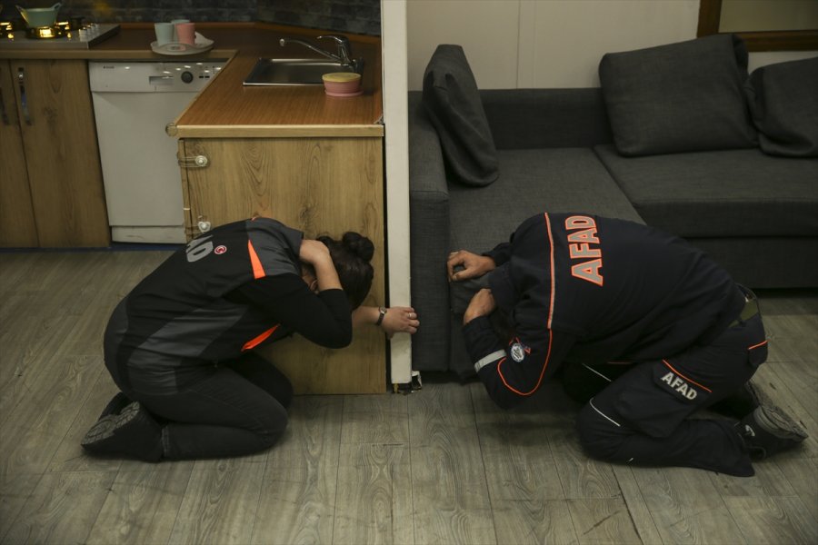 Bir deprem anının canlandırıldığı simülasyonda, AFAD personeli, sağlam eşyaların önünde çök-kapan-tutun yaparak sarsıntının geçmesini bekledi.