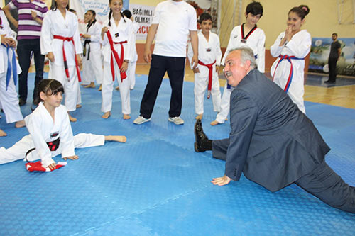 Gençliğinde taekwondo sporu ile ilgilendiği bilinen Şeker, kapalı spor salonunda taekwondo gösterilerini de izlerken küçük bir sporcunun bacaklarını sıfıra açmasında benzer şekilde karşılık verdi.
