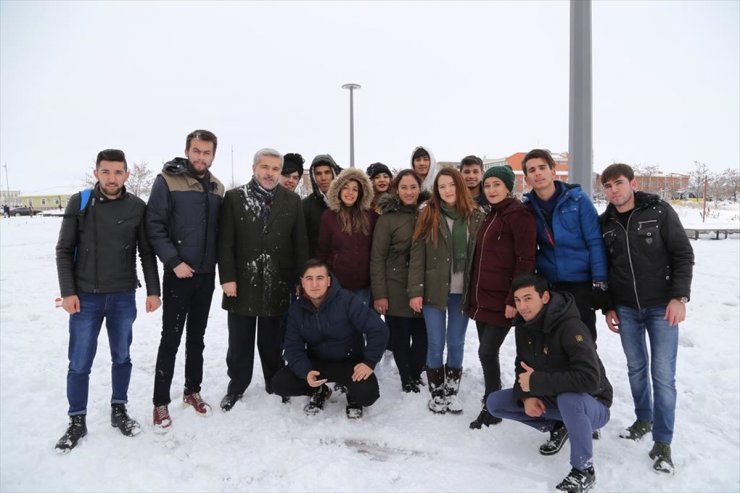Aksaray'da etkili olan kar yağışını değerlendiren öğrenciler Aksaray Üniversitesi (ASÜ) Rektörü Prof. Dr. Yusuf Şahin ile kar topu oynadı.