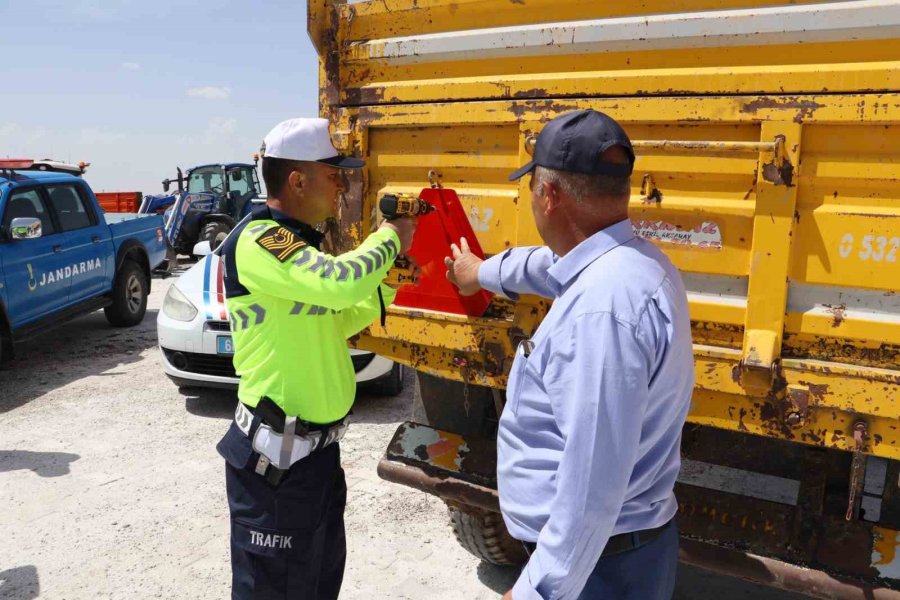 Aksaray'da jandarma tarafından, traktörlerin karıştığı trafik kazalarının önlenmesi amacıyla çiftçilere ve traktör sürücülerine yönelik eğitim verildi, römorklara reflektör takıldı.