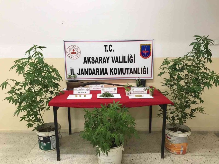 Operasyon, Aksaray'ın Gülağaç ilçesinde müstakil bir eve yönelik gerçekleştirildi. Edinilen bilgiye göre, 55 yaşındaki Tavil U. (55) isimli şahsın kenevir yetiştirerek uyuşturucu imalatı ve ticareti yaptığı bilgisine ulaşan İl Jandarma Komutanlığı İstihbarat Şubesi ekipleri, şahsı ve ikametini takibe aldı. Yaklaşık 1 hafta yapılan teknik ve fiziksel takibin ardından yeterli delil ve bulgulara ulaşan jandarma ekipleri, düzenlediği operasyonla şüpheliyi yakalayarak gözaltına aldı. Evde yapılan aramalarda kovalara ekilmiş 57 kök kenevir bitkisi, 350 gram kubar esrar, 3 adet haşhaş kozası, 50 gram kenevir tohumu ve 1 adet ruhsatsız av tüfeği ele geçirildi. Gözaltına alınan Tavil U. sorgulanmak üzere İl Jandarma Komutanlığına götürüldü.