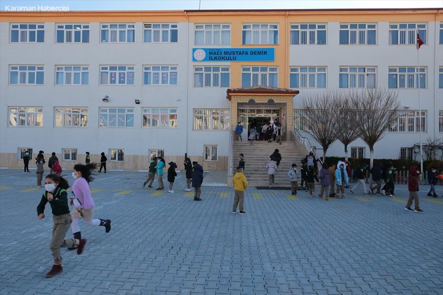 Erken saatlerde okula gelen öğrenciler, sosyal mesafe kuralına göre okul önünde İstiklal Marşı'nı okuduktan sonra sınıflara alındı.
