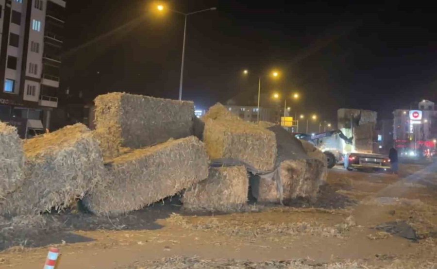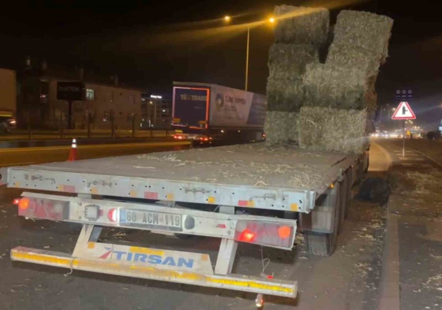 Aksaray'da viraja sert giren tırın dorsesindeki saman balyaları karayoluna devrildi. Trafiğe kapanan yolda etrafa saçılan saman balyaları forklift ile dorseye yüklendi.