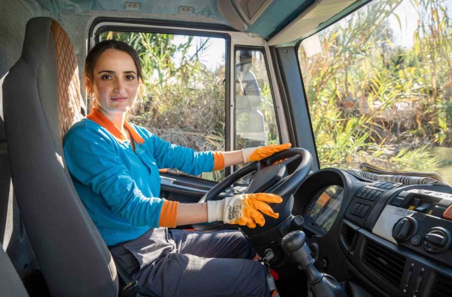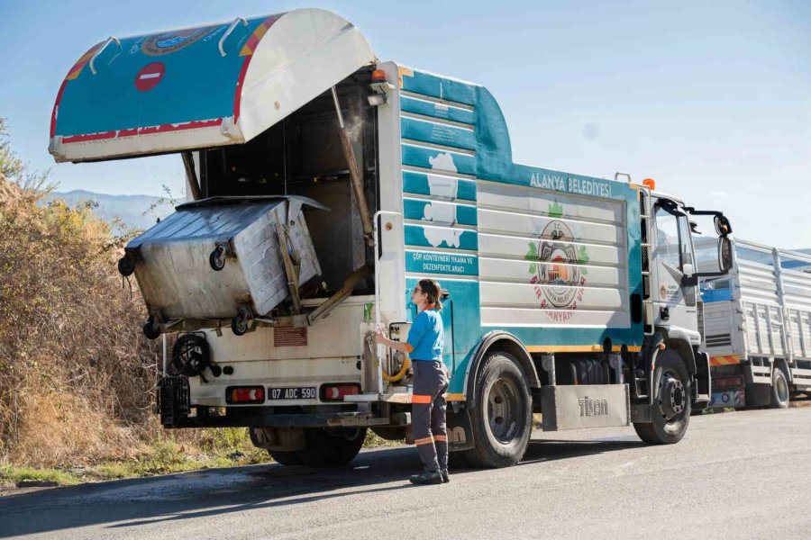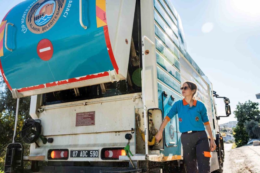 Kadın personelin temizlik çalışmaları, Alanya'nın farklı bölgelerinde dikkat çekiyor. Titizlikle yapılan temizlik çalışmalarına ilaveten, ağır vasıta çöp konteyner yıkama ve dezenfekte aracı sürücülüğü için de bir kadın şoför görevlendirildi. Bu kadın şoför, şehrin dört bir yanında temizlik ve sağlık için büyük bir titizlikle görev yapıyor.
