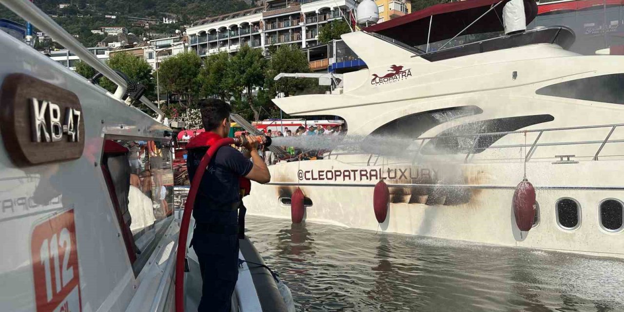 Antalya'nın Alanya ilçesinde iskelede demirli halde bulunan özel bir yatta çıkan yangın paniğe neden oldu.