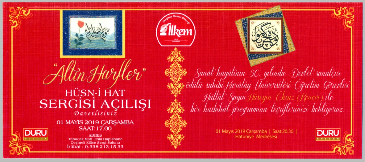 Sergileriyle ilgili bilgi veren“İLKEM” in başkanı Ali Yağcı: “Altın Harfler” ismini verdiğimiz ve birbirinden güzel 66 adet özgün Hüsn-i Hat şaheserinin sergileneceği etkinliğimizin açılışı, 01 Mayıs 2019 Çarşamba günü saat 17.00 de Çeşmeli Kilise Sergi Salonunda; Dünyaca ünlü hattatımız sayın Hüseyin Öksüz (Konevi) Bey’ in de bizzat katılımıyla gerçekleşecektir. Etkinliğimizin bayram ve tatil gününde olması nedeniyle açılışımızda çok sayıda sanatseverle bir araya geleceğimizi ümit ediyoruz. Her biri ayrı bir el emeği, göz nuru ve sanat şahaseri olan eserlerin sergisine; bütün halkımızı, emeğe saygı duyan herkesi ve tüm sanatseverlerimizi davet ediyoruz ve bekliyoruz.