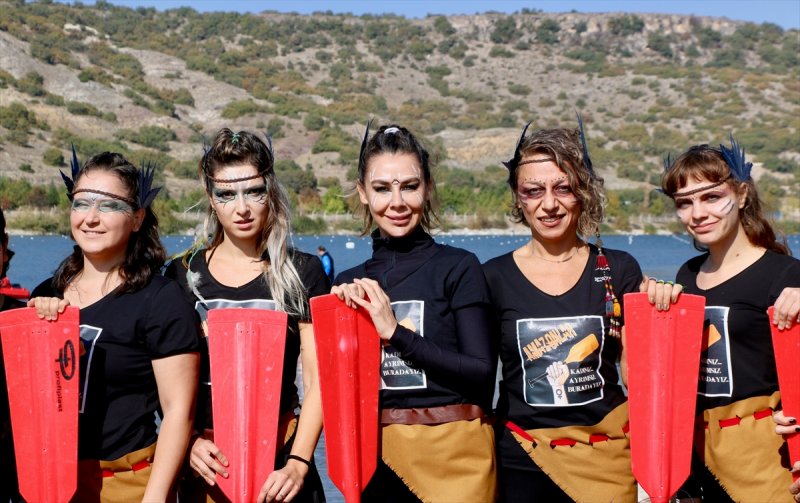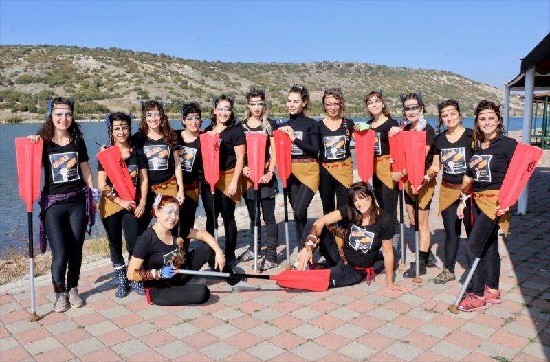 Evlerinde diktikleri kostümleri giyip, kendi yaptıkları makyajlarla "Dragon Yarışları Cumhuriyet Kupası" elemelerinin yapıldığı Sarısungur Göleti'ne gelen 16 kadın, "Amazonlar" adını verdikleri takımlarıyla müsabakalarda boy gösterdi. "Amazonlar Kadın Dragon Kürek Takımı", hemcinslerine yönelik şiddete karşı dayanışma içinde olduklarını göstermek için kürek çekti.
