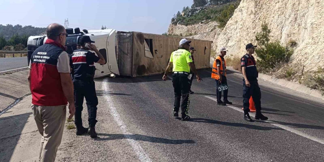 Mersin'in Silifke ilçesinde angus cinsi büyükbaş hayvanların yüklü olduğu tır devrildi.
