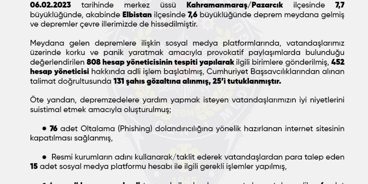 Sosyal Medyada Depremle İlgili Provokatif Paylaşımlarda Bulunan 25 Kişi Tutuklandı