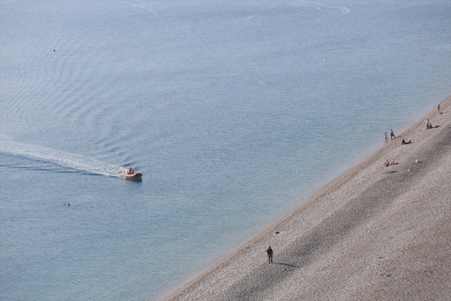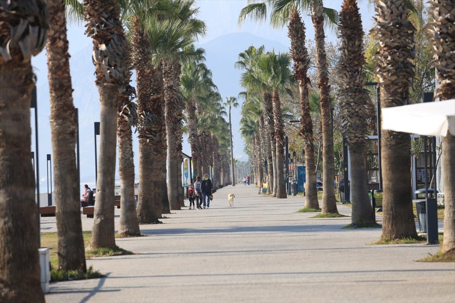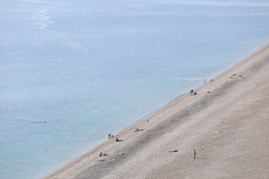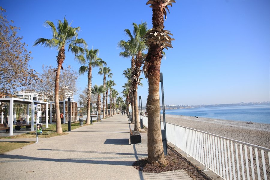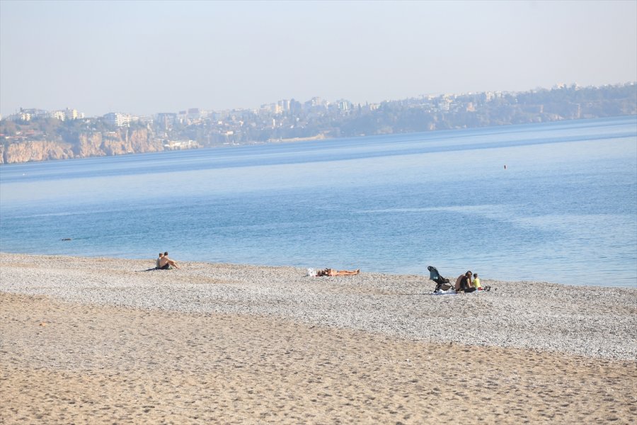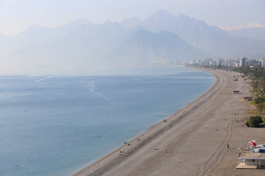 Dünyaca ünlü Konyaaltı Sahili'nde sadece turistlerin olduğu görüldü. Bazı turistler denize girerken, bazıları da spor yaptı.